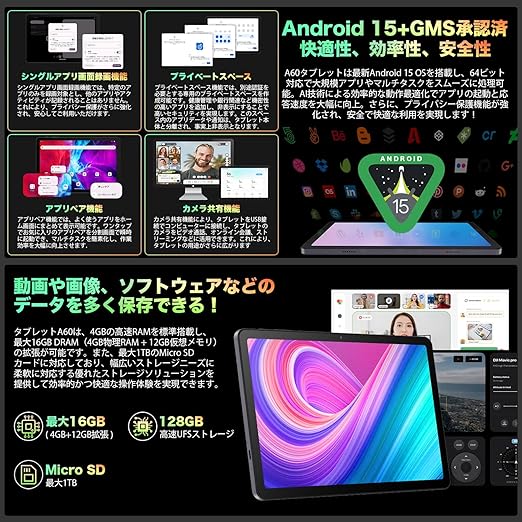 【Android 15搭載 10インチ高性能タブレット 新登場】 Tavoni A60 は最新の Android 15 を搭載し、64ビットアプリに最適化。起動や応答速度が大幅に向上し、これまで以上に快適な操作が可能です。ユーザーインターフェースも進化し、サードパーティ製アプリとの互換性がさらに高まりました。プライベートスペース機能により、大切なデータをしっかりと保護し、アプリペアリング機能でスムーズなマルチタスクも実現。さらに、単一アプリの画面録画や12GBのメモリーページング対応など、And