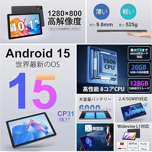Android15 CUPEISI CP31 タブレット アンドロイド15 Tablet 10.1インチ T606 8コアCPU 2.4/5GHz Wi-Fiモデル 20GBメモリ(6GB物理+14GB仮想)/128GBストレージ+1TB拡張 WidevineL1対応 GPS搭載 GMS認証 顔認識 OTG BT5.0 IPS1280*800 a | PCBASE