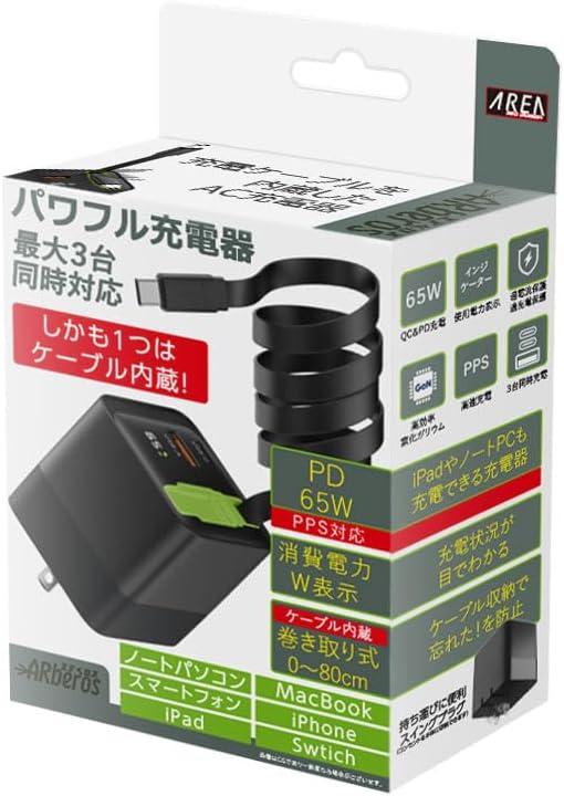 エアリア ARberos エアベロス PD65W対応 3台同時充電対応 見えるLED ワット表示 巻取り式80cmケーブル内蔵 AC充電器 パワフル 旅行 出張 ノートパソコン スイッチ SD-AC65CCA a | PCBASE