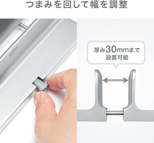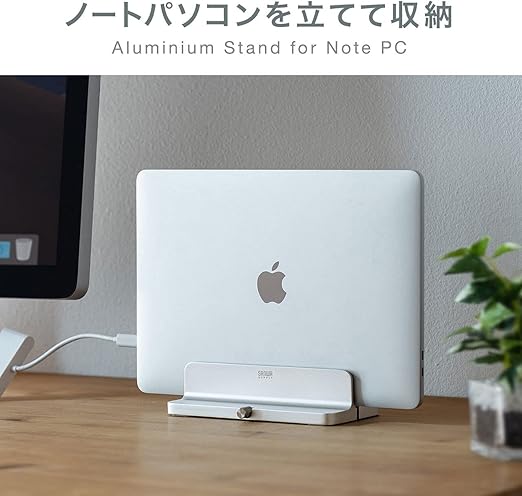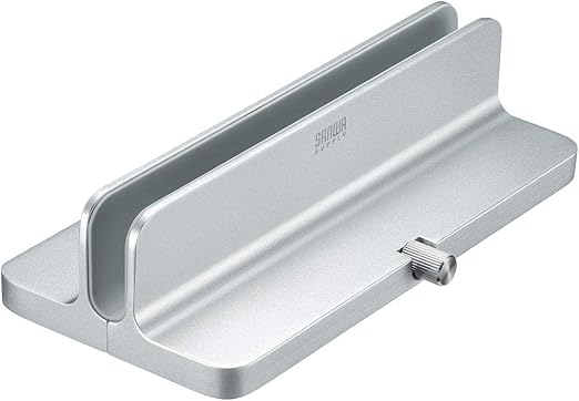 ノートパソコンの内蔵ディスプレイを閉じた状態で外部ディスプレイなどと接続して使う際に便利な縦置きタイプのアルミスタンドです。