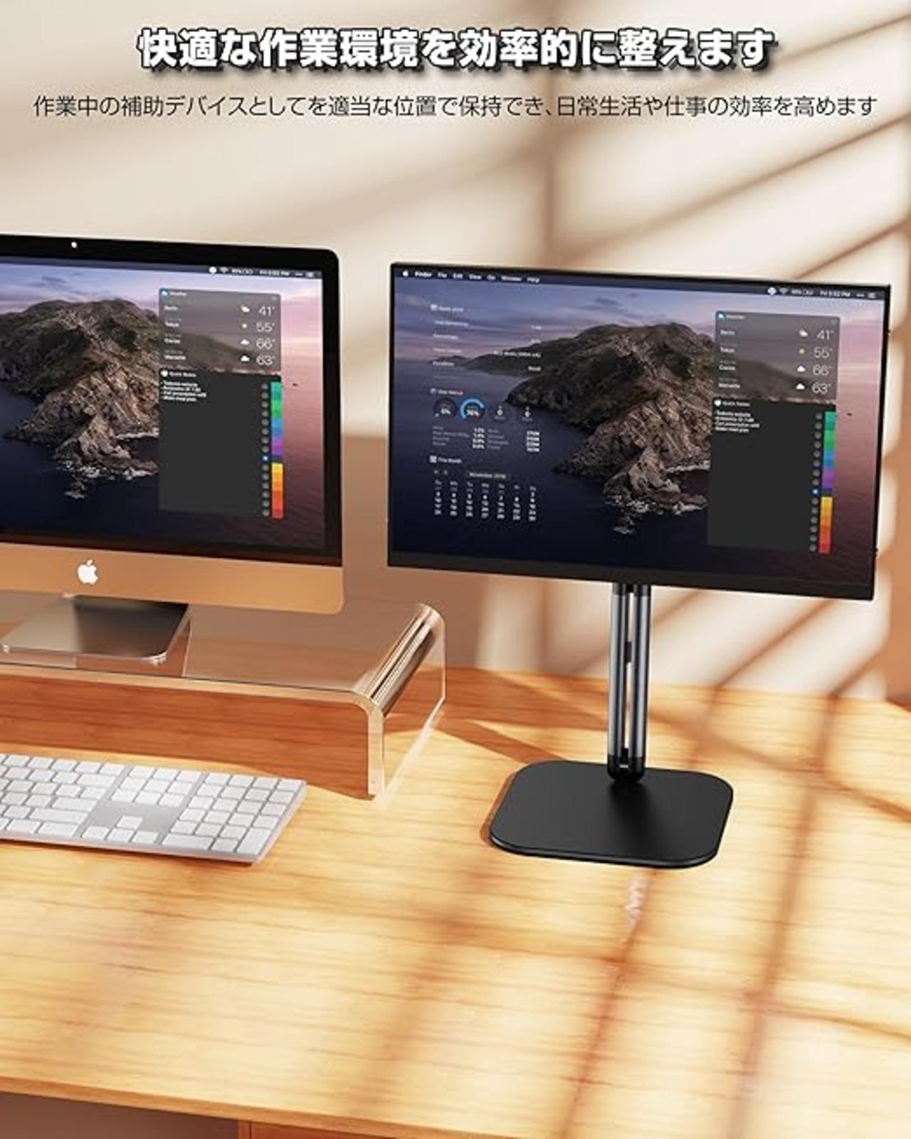 【モバイルモニタースタンド・可動域広い】本製品は高さ・角度を自由に調節できるようになっており、13‐24インチサイズに対応するVESAモニタースタンドです。作業中のモバイルモニターを適当な位置で保持することができ、快適な作業環境を整えます。または、モバイルモニターの高さをある程度自由に変えられるようになり便利、作業時の需要に合わせて調節でき長時間作業でも疲れや首と肩の負担を軽減し、健康的なワークスタイルをサポートします。