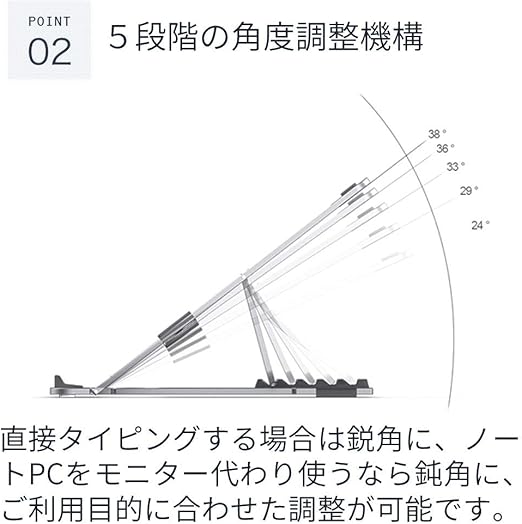 [ 5段階調整 ] 直接タイピングする場合は寝かせて、イラストを描くときはもうさらに寝かせて、または、セカンドディスプレイとしてもう少し立ててノートPCを使いたい…とそんな風にお考えになった経験はございませんか? LOEのこの新しいノートPCスタンドは、そんな様々なご利用シーンに合わせられるフレキシブルな角度調整式スタンドです。