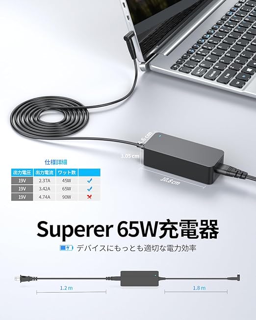 19V 3.42A 65W Acer用 ACアダプター 対応Aspire, Spin, Swift, TravelMate, Chromebook用 シリーズ ノートパソコン 2種類のDCジャック コネクタ変更可能 エイサー交換用充電器 3M PSE認証 PC電源アダプター 充電状態ランプ a | PCBASE