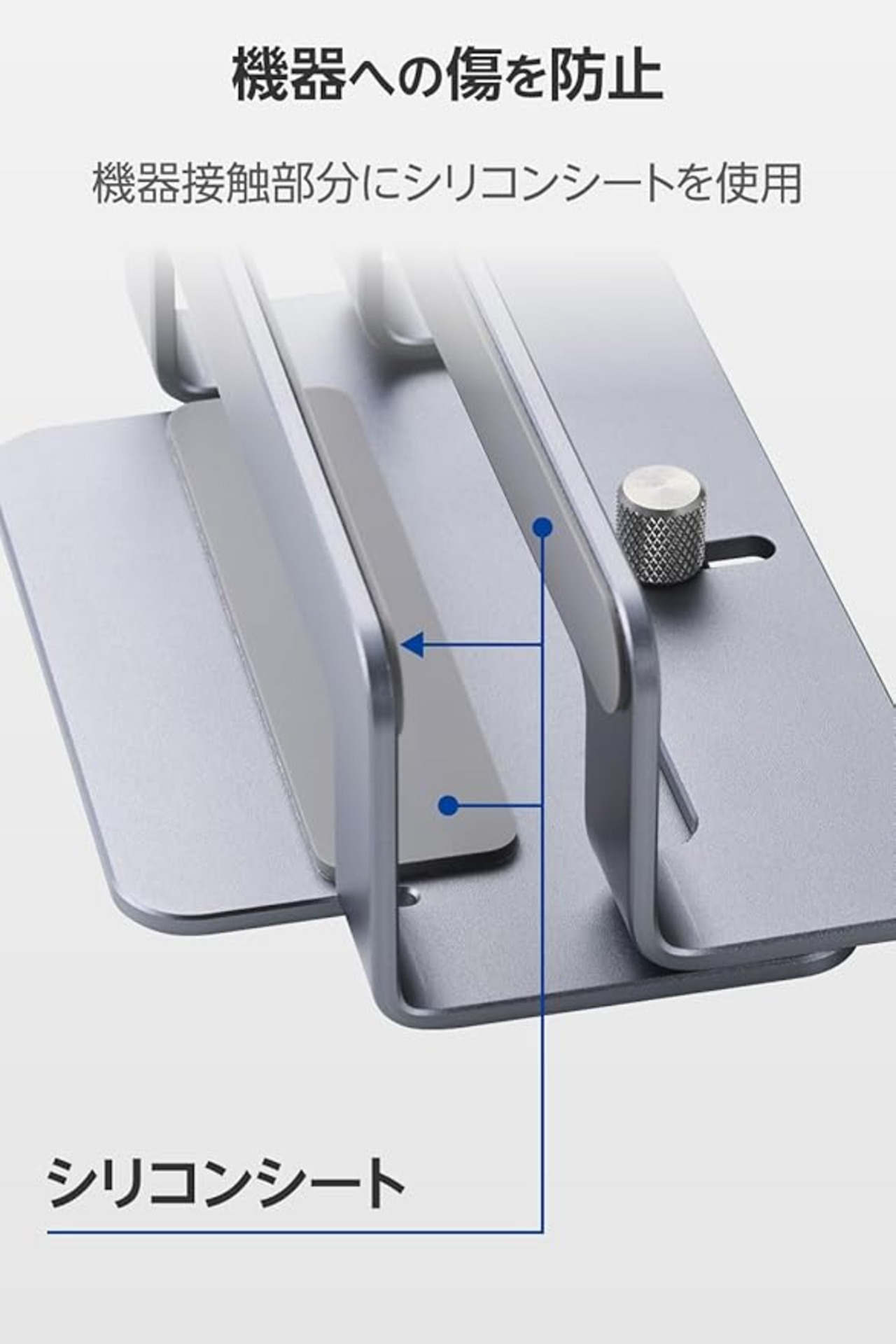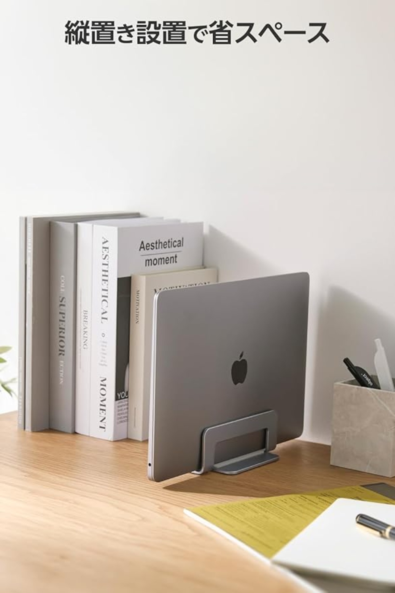 サイズが小さく省スペースなため、机の上を広々活用できるノートパソコン・タブレット用の縦置きスタンドです。