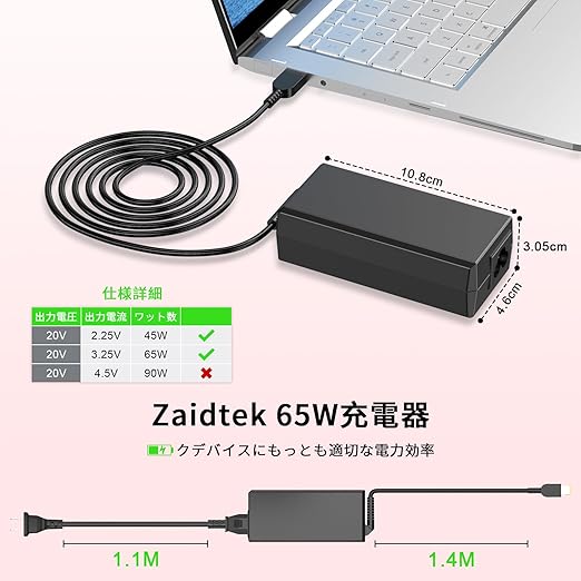 NEC LaVie用USB電源アダプタ: 入力: 100-240V 50-60Hz、出力20V-3.25A/ 20V-2.25A/ 18V-3A/ 15V-3A。コネクタタイプ: USB (黄色のチップ、タイプCではありません)、ワット数: 最大65W。コードの長さ: 3M。Lenovo Thinkpad用電源アダプタ。