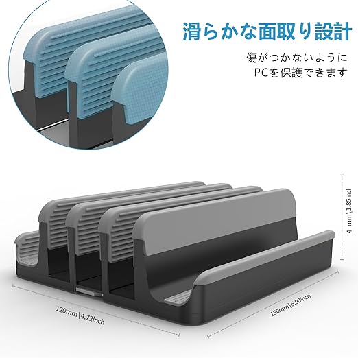 【ノートPC 3台収納対応】3台のノートパソコンを同時に立てて収納できる設計です。ホルダーの幅は調整可能で、ノートPCはもちろん、iPad、タブレット、本などもスッキリ縦置き収納できます。デスクの作業スペースを広く使え、整理整頓に役立ちます。