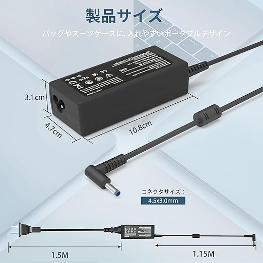 ●※【HP 充電器の電力仕様】入力: 100~240V~1.7A 50/60Hz、出力最大: DC 19.5V 3.33A 65W、コネクタ: 外径 4.5 mm / 内径 3.0 mm 青い先端