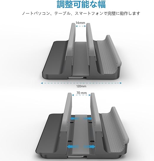 【サイズ調整可能】- ほとんどのノートパソコンやノートブックブランドに対応!幅を調整可能で、0.55インチx14 mmから2.75インチx70 mmまでの厚みにも対応します。