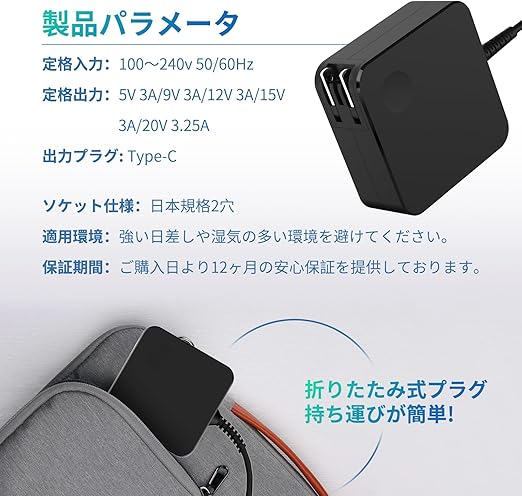 【商品情報】 入力:100V-240V 出力:5V 3A, 9V 3A, 12V 3A, 15V 3A, 20V 2.25A, 20V 3.25A ワット数:65W コネクタ:タイプc