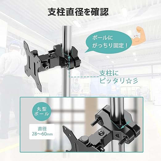 【商品仕様】ポールに設置できるモニターアームです。対応丸パイプの直径は28〜60mmです。17〜32インチ対応、耐荷重:8kg。VESA規格75×75mm、100×100mm。(ご注意:取り付けポールは含まれていません)