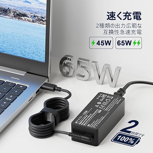 【65W USB Cノートパソコン充電器】入力:100-240V〜50-60Hz 1.8A、出力:5V / 3A、9V / 3A、15V / 3A、20V / 3.25A。コネクタサイズ:Type-C、ワット:65W( 互換性のある45Wラップトップ充電器)