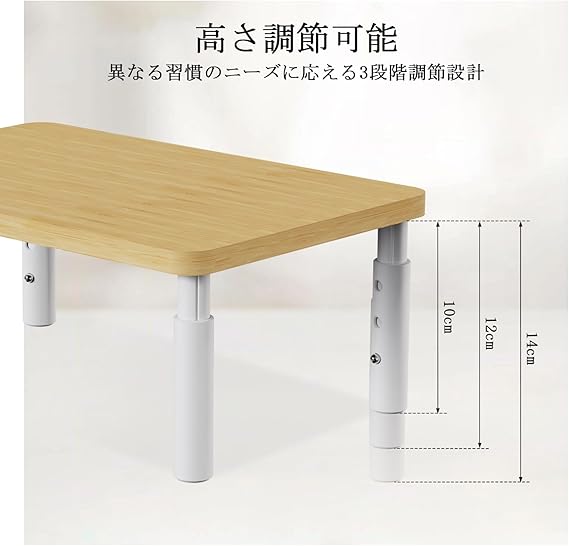 【製品仕様】幅:39.5cm 奥行き:19.5cm 高さ:10-12-14cm三段階高さ調整可能 材質:天板:竹木。厚さ 1.2 cm。 4本の足: ABS 304ステンレス 直径1.6 cm 滑り止めゴム付 最大耐荷重:15kg