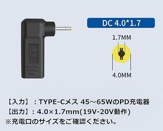 4.0×1.7mm(19V-20V動作)。*ご購入の前に!純正充電器の充電口のサイズをご確認ください。同一メーカーであってもサイズが数種類ある場合があります。