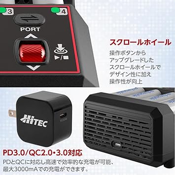 PD (パワーデリバリー)とQC (クイックチャージ)に対応。4本同時に最大2500mAで放電。バッテリーの実力を測定。スクロールホイールを装備し操作性が向上。日本語表示対応のカラー液