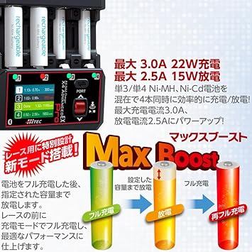充電電流を0.20Aから3.0Aまで調整可能。様々な電池に合わせてカスタマイズ可能。上級者の裏技充電を再現して、ピークパフォーマンスを生む「Max Boost機能」を装備。4つの電池を効率的に電力供給し充電。最大3000mAで充電が可能。