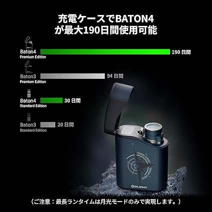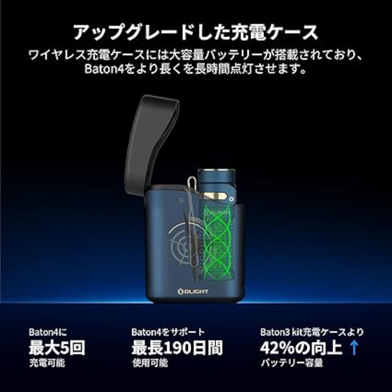 {1300ルーメン高輝度照明+最長190日間稼働} OLIGHT Baton 4の最大輝度は1300ルーメンで、アウトドアでも十分の明るさを提供でき、170mの最大射程に達し、緊急用、防災用、停電対策、日常生活などの様々なシーンにご適用しています。Baton 4 Kitはワイヤレス充電ケースも付っています。充電ケースには内蔵された高品質専用バッテリーの容量は 42% 増加されるし、Baton 4を5回ぐらい充電させます。充電ケースでBaton 4の使用時間が大幅に延長され、月光モードで最長190