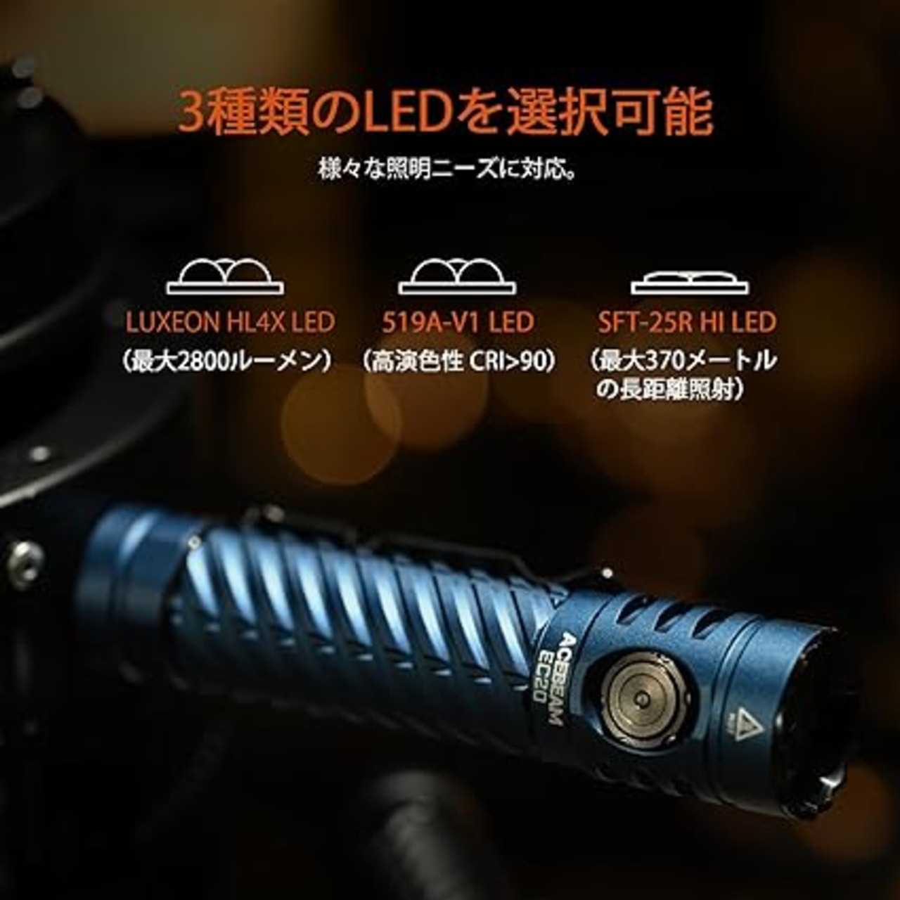 ACEBEAM EC20 EDC マルチ光源 懐中電灯 2500ルーメン 高出力 370メートル 長距離 無段階調光 フリッカーフリー LEDフラッシュライト IP68 2m防水 マグネット式テールスタンド 電池監視 キャンプ 防災 停電対策 緊急 ハンディライト ANSI規格準拠 (青 3*SFT-25R HI 6500K LED) a | PCBASE