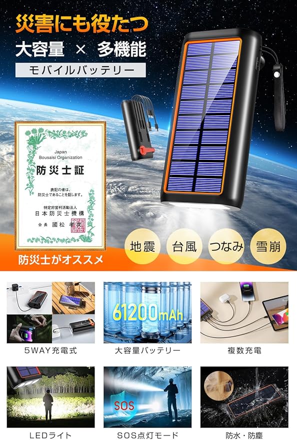 ソーラーチャージャー 【 新登場 & 防災士監修 & 手回し充電】 61200mAh大容量 モバイルバッテリー ソーラー 3A急速充電 4本ケーブル内蔵 IPX7防水 携帯 スマホ充電器5WAY蓄電 6台同時充電 高輝度LEDライト付き 太陽光で充電でき 耐衝撃 緊急停電対策 SOSモード 地震/災害/旅行/アウトドア iPhone/iPad/Android各種デバイス対応 a | PCBASE