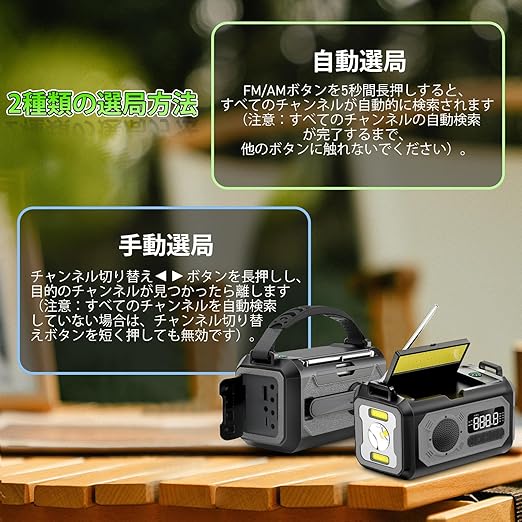 【12000mAhの大容量バッテリー搭載で、安心の電源供給】 このラジオは、12,000mAhの大容量バッテリーを搭載しており、緊急時には携帯電話や小型タブレットなどのデバイスに電源を供給することができます。停電時や災害時でも、大切なデバイスの充電を確保し、安心を提供します。