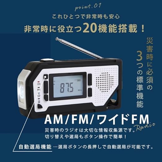 【ソーラー多機能ラジオ】太陽光で発電できるソーラーパネルを搭載し、USB充電、手回し発電、乾電池にも対応した4WAY電源の多機能ラジオです。災害時に頼れるラジオ機能のほか、スマホなどのモバイル機器への充電、LEDライト、SOSアラーム、点滅ライトを搭載。停電時やアウトドア、防災対策用として、これ1台で複数の役割を果たします。