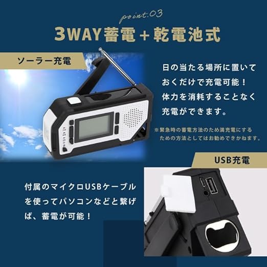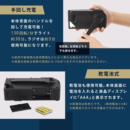 【乾電池対応】停電や長期間の充電困難な状況でも安心できる乾電池対応。USBやソーラー、手回しでの蓄電が難しい夜間や曇天でも、単四乾電池をセットするだけでラジオやライト機能を