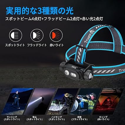【加强版!実用的な3種類の光】H6R強力なledヘッドライトは白&赤二種類のLED光源を搭載し、8つの点灯モードがあり、1つのキーで消灯できます。スポットモード:低→中→高→ターボ。ワイドモード:赤点灯→中→高→赤色SOS。真っ暗な夜は光を提供するだけでなく、アウトドアで遊びの道具として、気持ちを和らげることもできます。この明るいLED懐中電灯は4000K、CRI95以上の高演色・高色温度LEDチップ搭載し、明るさ最大1350ルーメンを実現!そして、ヘッドライトは長距離スポットライトとや大面積フ