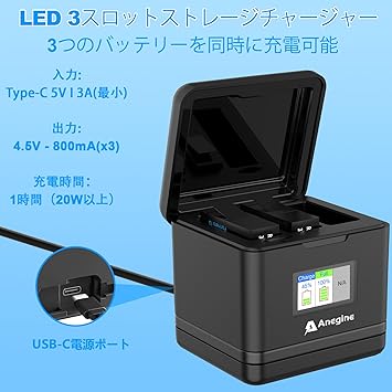 Anegine Hero 13 バッテリー充電器セット 2個2100mAh大容量電池+LED充電器 Hero 13予備バッテリー チャージャー Type C USB 収納式 同時充電可能 対応種類 (Hero 13 Black カメラに対応) (3チャンネルチャージャー) a | PCBASE