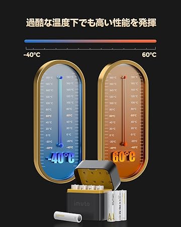 「3600mWhリチウムイオン単三形充電池」imuto 3600mWh大容量のリチウムイオン単三形充電池は、超長待機時間で、充電して繰り返し使えます。電気代を節約でき、環境にも優しいです。消費電力の高いデバイスに最適です。あらゆる種類のビデオドアベル、セキュリティカメラ、トラッキングカメラ、煙探知機、スマートロック、ソーラーライトに適応です。
