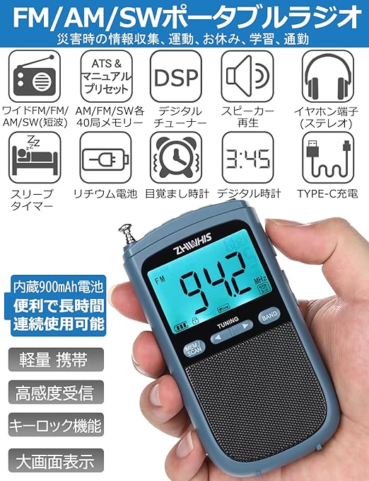 ZHIWHIS ラジオ小型 FM/AM/SW/ワイドFM対応 大画面/900mAh/デジタル時計/目覚まし時計/タイマー/プリセット/キーロック USB-C充電式携帯DSPステレオ受信機 ポータブル軽量 コンパクト 通勤 防災 旅行 新登場ZWS-298 b | PCBASE
