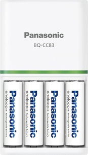充電式エボルタ、エネループの両方の充電池に対応した「充電器 BQ-CC83」のセット(充電時間)単3形×2本を約3.5時間で充電可能単4形×2本を約2時間で充電可能