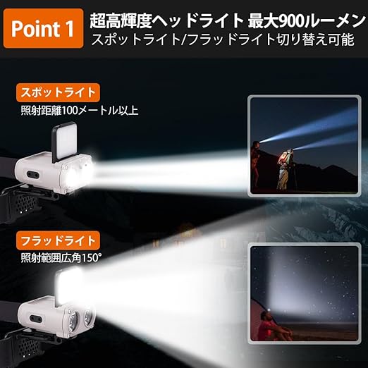 【Max 900 ルーメンキャップライト】キャップライトの照明装置は、前部に配置されたLEDスポットライトと上部に配置されたLEDパネルライトによって構成されており、同時に使用することで最大900ルーメンの明るさを実現します。スポットライトの最大輝度は700ルーメンであり、パネルライトの最大輝度は500ルーメンです。