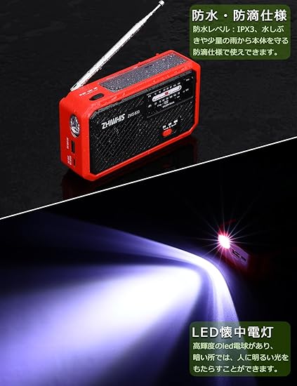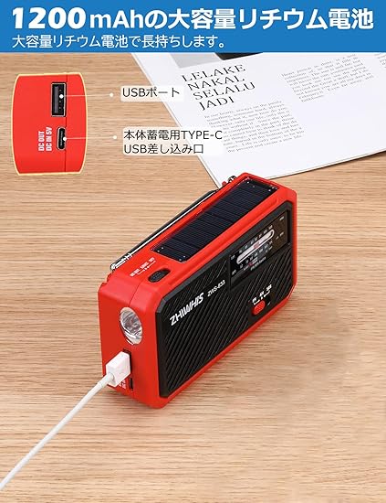 ZHIWHIS 防災ラジオ FM/AM/ワイドFM対応 懐中電灯 (手回し充電/ソーラー充電/USB-C充電/乾電池使用可能)【1200mAh/SOSアラート付き/USB充電】 充電式電池式 携帯小型 震災 台風 停電緊急対策 新登場ZWS-833 a | PCBASE