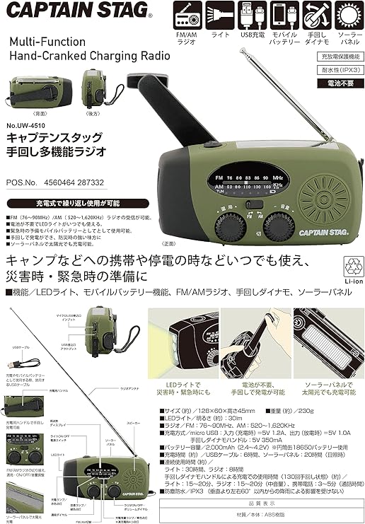 機能:LEDライト、モバイルバッテリー機能、FM/AMラジオ、手回しダイナモ、ソーラーパネル
