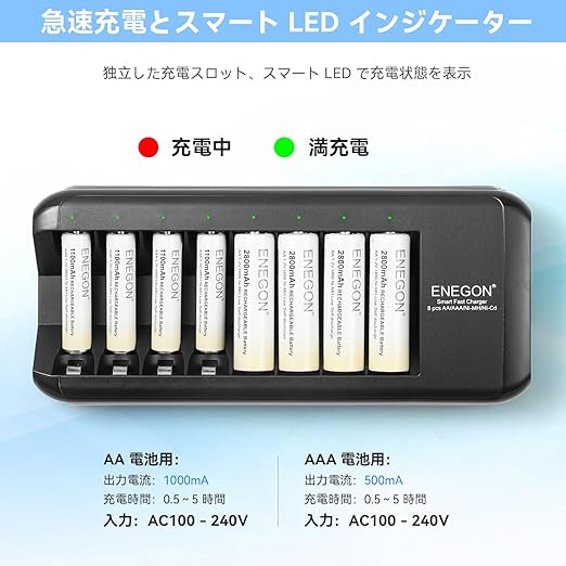 独立充電&急速充電対応 最大1000mAの充電電流で、1本から8本までの単三・単四形Ni-MHまたはNi-Cd充電池を、最短5時間以内にフル充電可能。各スロットが独立しているため、好きな本数を同時に充電できます。