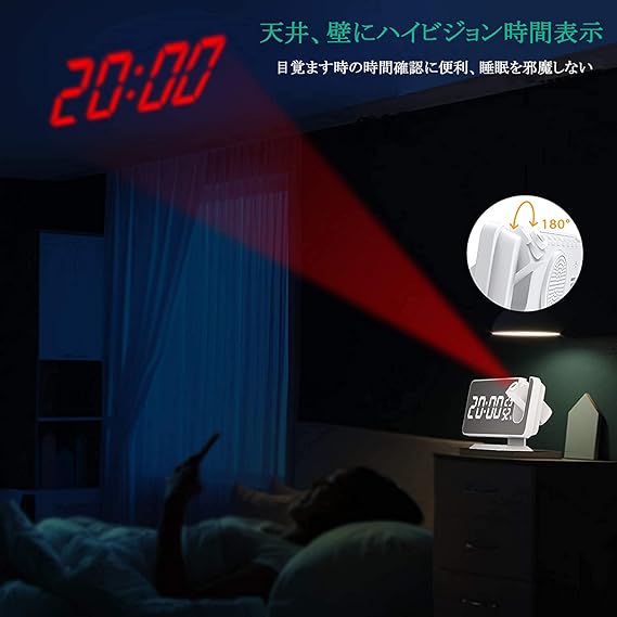 ご注意:本製品は維凱電子だけ正規品です。【プロジェクター機能付き】この多機能目覚まし時計は角度180°調整可能な投影機能が付き、天井または壁に時間などの表示を投影することができます。投影の有効距離は5mで、最適距離は2~3mです。ベッドであおむけに寝ている時、ソファーに座っていて、目覚まし時計のLED画面が見えない時、或いは視力障害のある人が使う時に、プロジェクター機能は大きな役割を果たします。