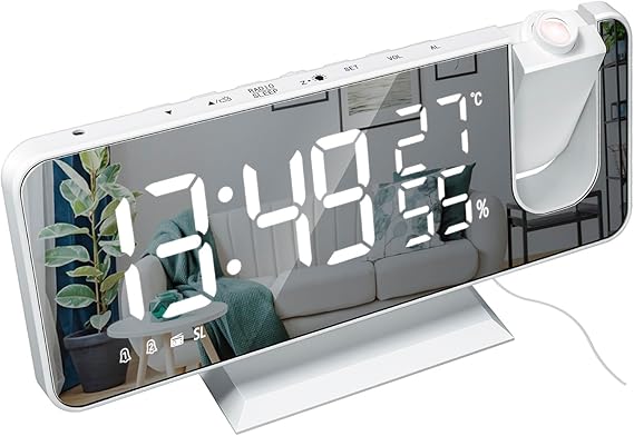置き時計 デジタル LED大画面【 投影/FM ラジオ機能/ミラー】4段/自動輝度調節 0-15級音量調節可能 温度・湿度表示 2組アラーム ベル設置可能 USB充電 おしゃれ 家庭用 部屋 オフィス 日本語説明書付き (プロジェクター 時計・ホワイト) a | PCBASE