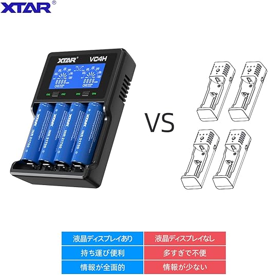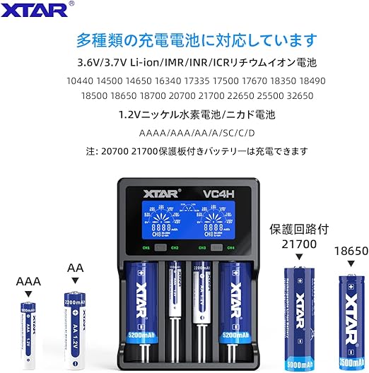 XTAR VC4H リチウム充電器 電池充電器 3.6V/3.7Vリチウムイオン電池 10400〜32650 保護回路付21700電池対応 1.2V ニッケル水素電池/ニカド電池対応 AAAA/AAA/AA/A/SC/C Type-C入力 バッテリー活性化機能 Li-ion Ni-MH Ni-Cd IMR INR ICR a | PCBASE