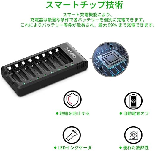 大容量 1.2V ニッケル水素 電池、8 ベイ スマート チャージャー付き 2800mAh AA 充電式電池 8 個パック