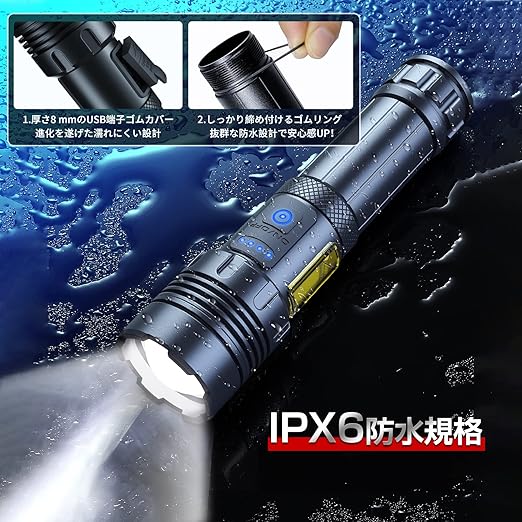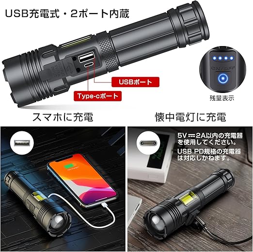 Eornmor 懐中電灯 強力【防災士監修・超高輝度・XHP160チップ】5000mAh 26650バッテリー付 軍用 最強 Type-C充電式/電池式 単4電池適用 ハンディライト COB作業灯 IPX6防水 7モード調光 ズーム式 耐衝撃 残量表示機能 作業用 停電 地震 避難対策 防災グッズ a | PCBASE