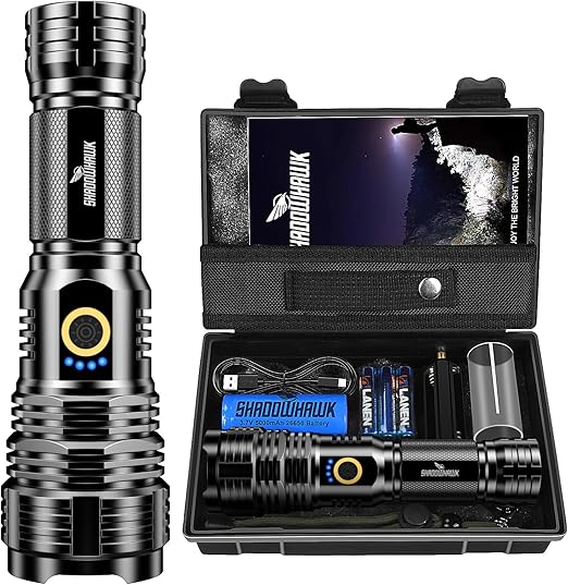 【進化版!30000ルーメン 懐中電灯 led 強力 軍用 最強】Shadowhawk S1915 懐中電灯 強力 は最新のアップグレードされたXHP70.2LEDチップを搭載するので、通常のLED懐中電灯の10倍の超強力ライトを実現できます。このledフラッシュライトは最大30,000ルーメンの驚異的な明るさを生成できます。120平方メートルの部屋を問題なく照らしたり、最大500メートル離れた物体に焦点を合わせたりすることができます。懐中電灯やアクセサリーはギフトボックスに入れることができ、持