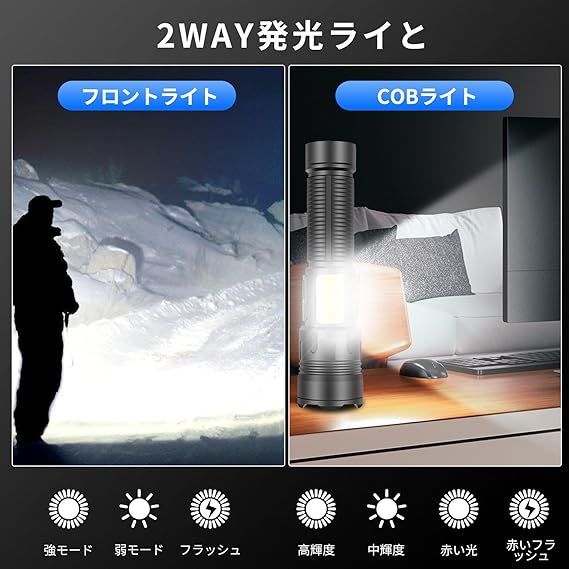 【高輝度&7つのモード&ズーム機能】XHP160LED電球を採用し、最大1000mの照明距離を実現。7つのモード(正面照射:強光・弱光・フラッシュ、COB作業灯:高輝度・中輝度・赤色光・赤色閃光)で調整可能。スイッチ操作でモード切替が簡単。ズーム機能により、広範囲の照明と遠距離の集光を自在に切り替え可能。