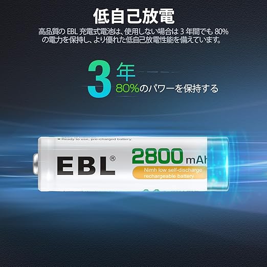 「繰り返し充電池」充電を繰り返し使っても劣化が少ないです。Hg/Cd/Pdなどの有害物を使わず、エコタイプの電池です。密閉型で液漏れ防止、低温でも寒い場所でも性能を発揮できます。