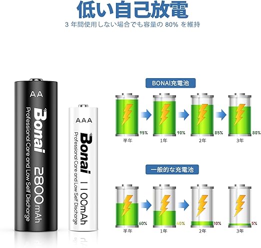 【 放電抑制性, 耐久性】ち3年間保存後も初期容量の約80%を保持します。安全上の理由から、お