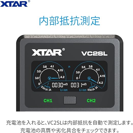 XTAR VC2SL リチウム充電器 電池充電器 最大2Ax1/1Ax2 3.6V/3.7Vリチウムイオン電池 10400〜26650 1.2V ニッケル水素電池/ニカド電池対応 AAAA/AAA/AA/A/SC/C Type-C 入力 バッテリー活性化機能 Li-ion Ni-MH Ni-Cd IMR INR ICR 電圧・充電容量・充電電流・内部抵抗値の表示機能 a | PCBASE