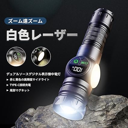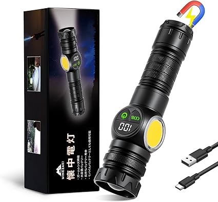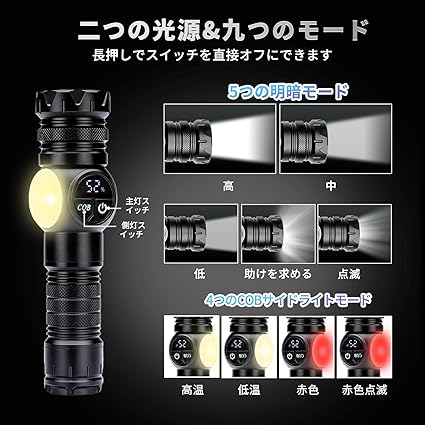 【懐中電灯 製品仕様】サイズ:17cm*4.2cm*3.9cm 重量:約190g(本体)バッテリー重量:約70g 【2025年新型超高輝度小型軽量懐中電灯】新世代26650エコリチウムバッテリーを採用し、全体的に超長寿命でコストパフォーマンスに優れています。1500ルーメンの照射光源で、照射範囲は500メートルを超えます。懐中電灯の側面にはCOBライト機能が追加されており、合計9種類の点滅モードがあります。