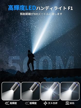 【高輝度照明モード】LEDハンドライトF1は高輝度XPE LED電球を搭載しており、照明範囲と照明効果が大幅に向上します。ハイライト、ローライト、ストロボ、SOSの4つの照明モードがあり、様々なニーズを満たす十分な照明を提供します。