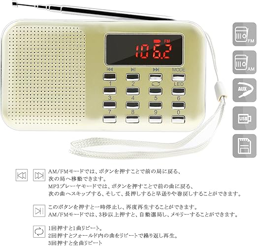 【周波数範囲】70-108MHZ(FM)、522-1710KHZ(AM)。周波数が広くて、ワイドAM/FM補完中継(TBSラジオ、文化放送、ニッポン放送)受信可能。初めてご使用する場合、FM・AMを検索したら、後の使用に周波数直接入力での受信も可能。日本語説明書も付け、操作が便利