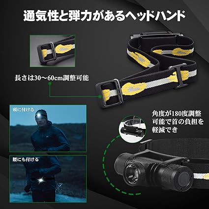 【軽量・高輝度最大500ルーメン】サイズは8.5x5x3.7cm、ライト+ベルト一緒は僅か118グラムで超軽量ヘッドライトです。高輝度で高品質のXPG2ランプビーズを採用しており、強照明モードで500ルーメン、弱照明モードで200ルーメンに達します。明るさ5段階調整モードならルーメンは50~500まで調節でき、照射距離最大約200メートルです。ワンスイッチで明るさや照明モードを調整でき、ソフトボタンは押しやすくて、片手でも簡単に操作できます。照射角度を180°まで調整可能で、オールラウンドな照明