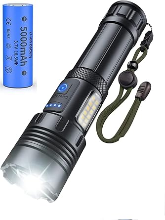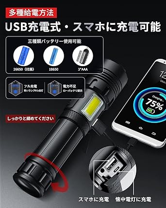 【超高輝度 XHP160】懐中電灯 強力 軍用 最強 ハンディライトtype-Cード充電式5000mAh大容量 PSE認証取得 LEDライト 白&赤色灯 COB作業灯 IPX6防水 高輝度 フラッシュライト 強力 7モード調光 ズーム式 a | PCBASE