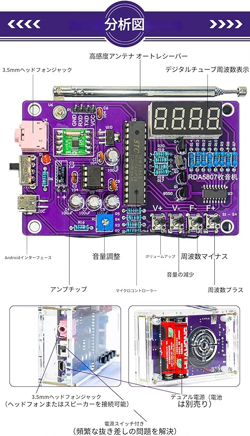 zmart DIY FM ラジオ 電子キット 調整可能な 周波数 87-108MHz デジタル ディスプレイ DIY はんだ付け プロジェクト 練習用 はんだ RDA5807S 日本語説明書つき a